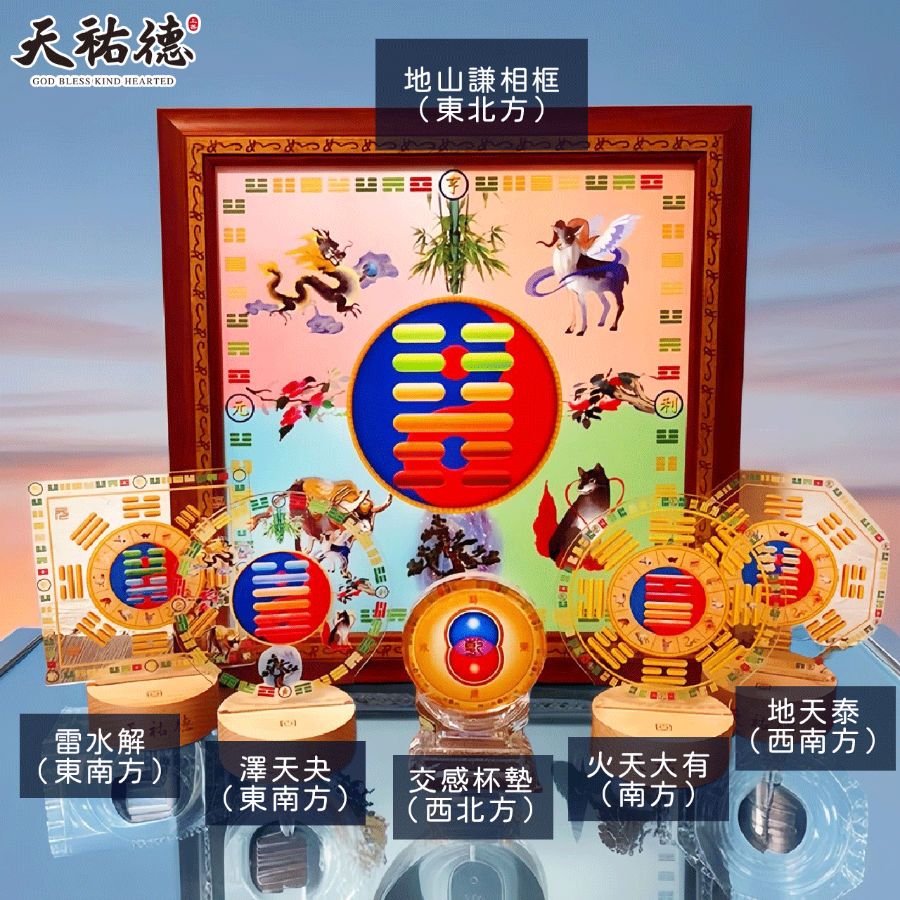 地山謙補財庫40公分卦版配雷水解+地天泰+澤天夬+火天大有木頭卦燈各1+1個黃色交感杯墊,共六件組。