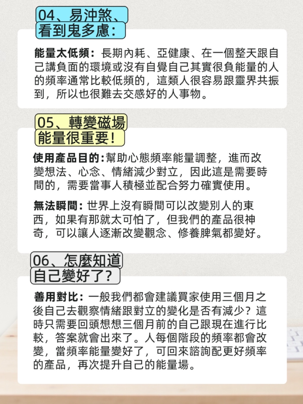 有的人用了產品整天都在觀察今天自己的睡眠品質、感受、甚至認為敏感體質是靈性;這其實是靈異體質敏感體質、多思體質,愛聚焦錯誤不正確觀點及關注