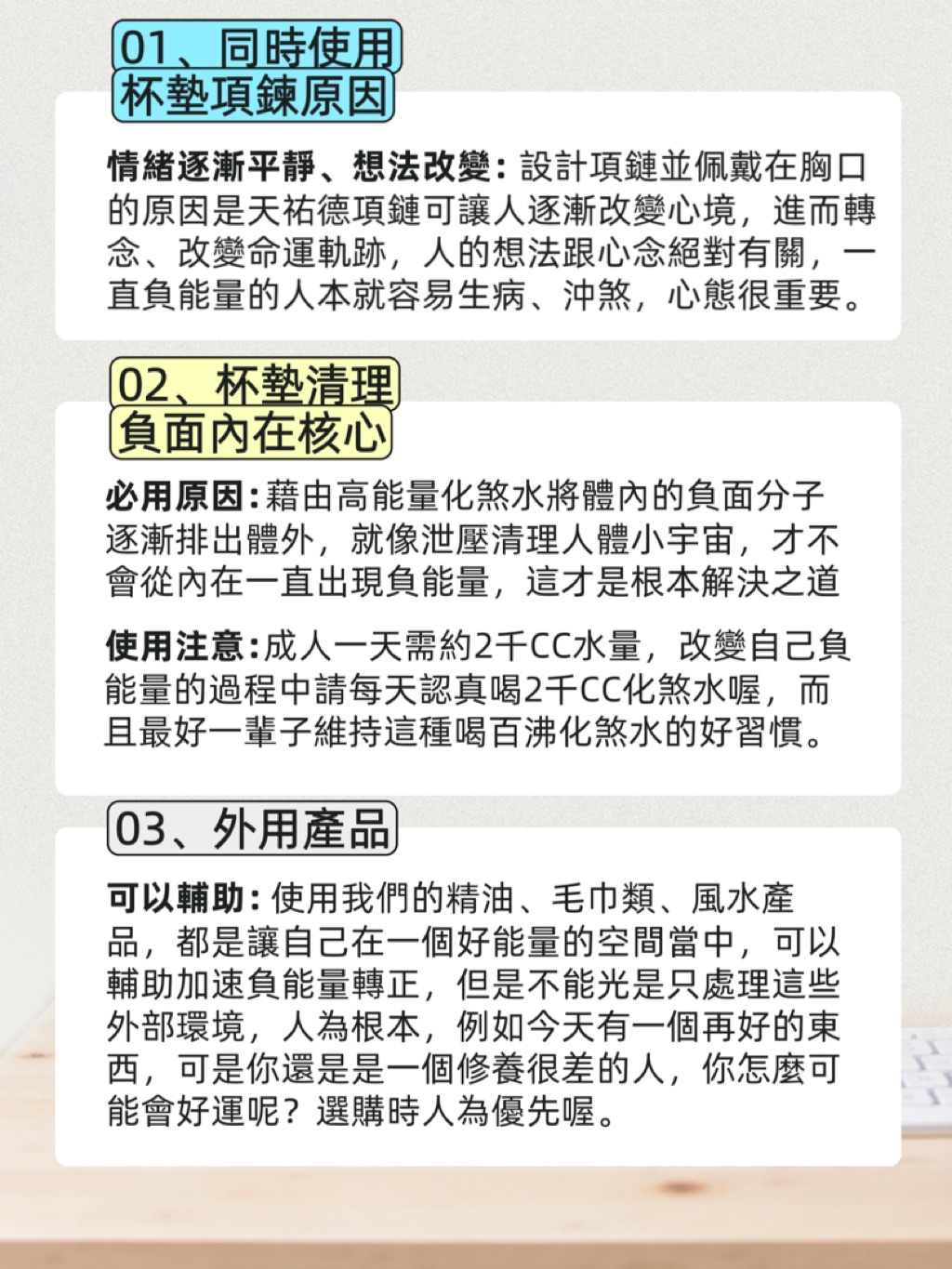 1️⃣認真使用天祐德杯墊喝化煞水(解體內負能量),每天至少要2000 CC以上。