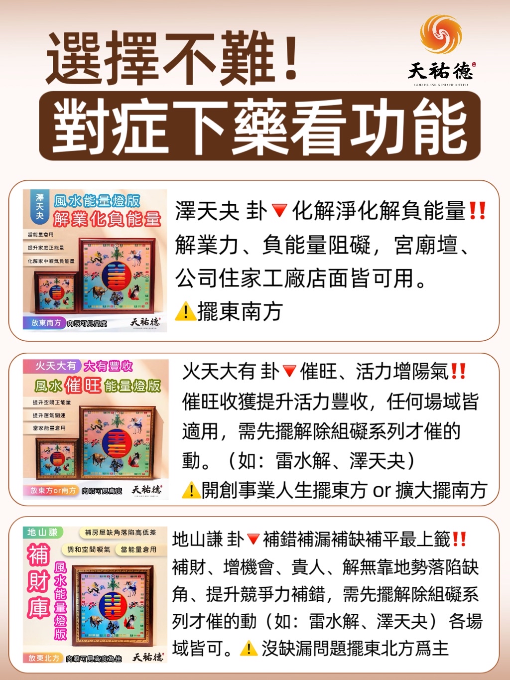 ❤️火天大有卦燈:開創事業人生擺東方 or 擴大事業擺南方,催旺、收穫、提升、活力、豐收,任何場域皆適用,需先擺解除阻礙系列才催得動,如雷水解、澤天夬‼️