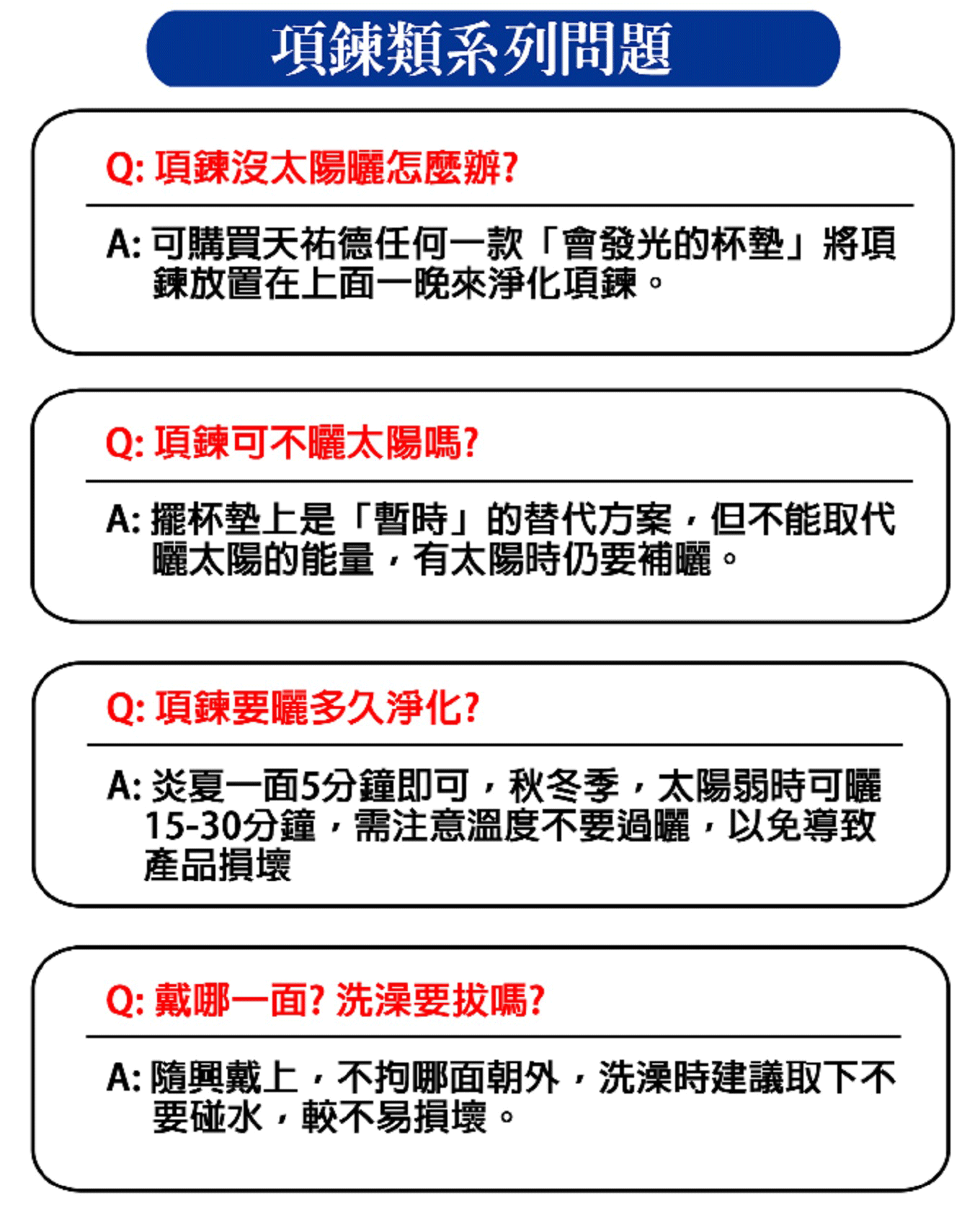 拿到可直接購買配戴,1-2週拿去曬太陽15分鐘,剛開始嚴重者3天曬一次,無需任何淨化方式,就是記得曬太陽,不能改成手鍊,一定要戴對應心臟胸口位置唷,這是設計成項鍊的原因,當卦破損、褪色就需要更換,就無效果,繩子斷掉可以自行拿去更換鍊子無仿,而且沒有使用期限,化煞變的超簡單❤️不用一直收驚、跑宮廟真的讓爸媽鬆口氣🤭