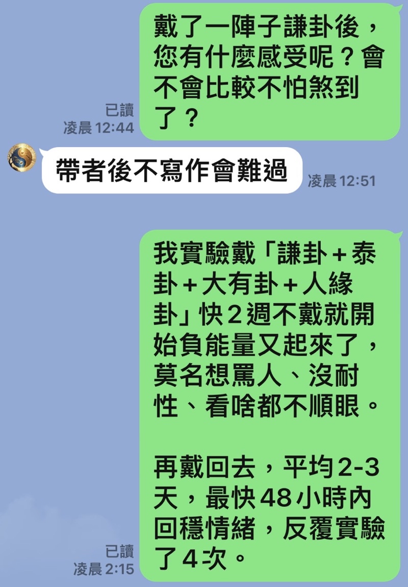 2、三個墜子時(地山謙+地天泰+火天大有+雷水解+交感圖+人緣圖)我前面3-7天睡的很久,然後就開始精力充沛,愛學習、愛寫東西、智慧整合融合力大提升、產能提升、靈感創意很多,情緒穩定天天很開心。
