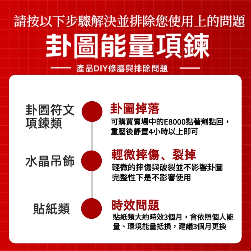 ⚠️請理解由於產品大多為水晶製成,皆不能鑽孔,否則影響能量,因此與五金脫落問題採用專用黏著劑就能修復🔻
