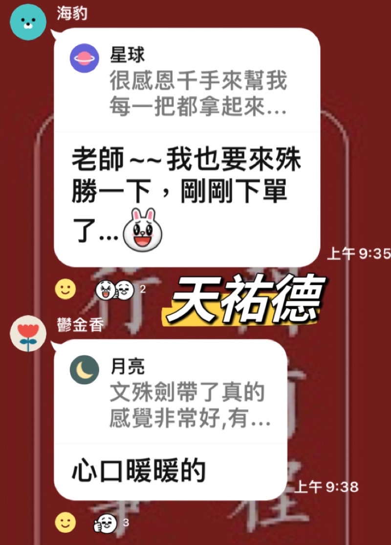 3、敬請大德:文殊寶劍是開智慧、修持正、淨、覺,破障、斷無明的,配戴者請善發心修持,不要誤會劍是要傷害無形眾生的,這樣的心念是錯的,六道都是眾生唷。對諸佛菩薩來說,眾生皆平等,人要善始善終,用上德才能感動天地,這才是解冤結的根本法。抱持此心配得這寶劍修持必能增益 🙏阿彌陀佛